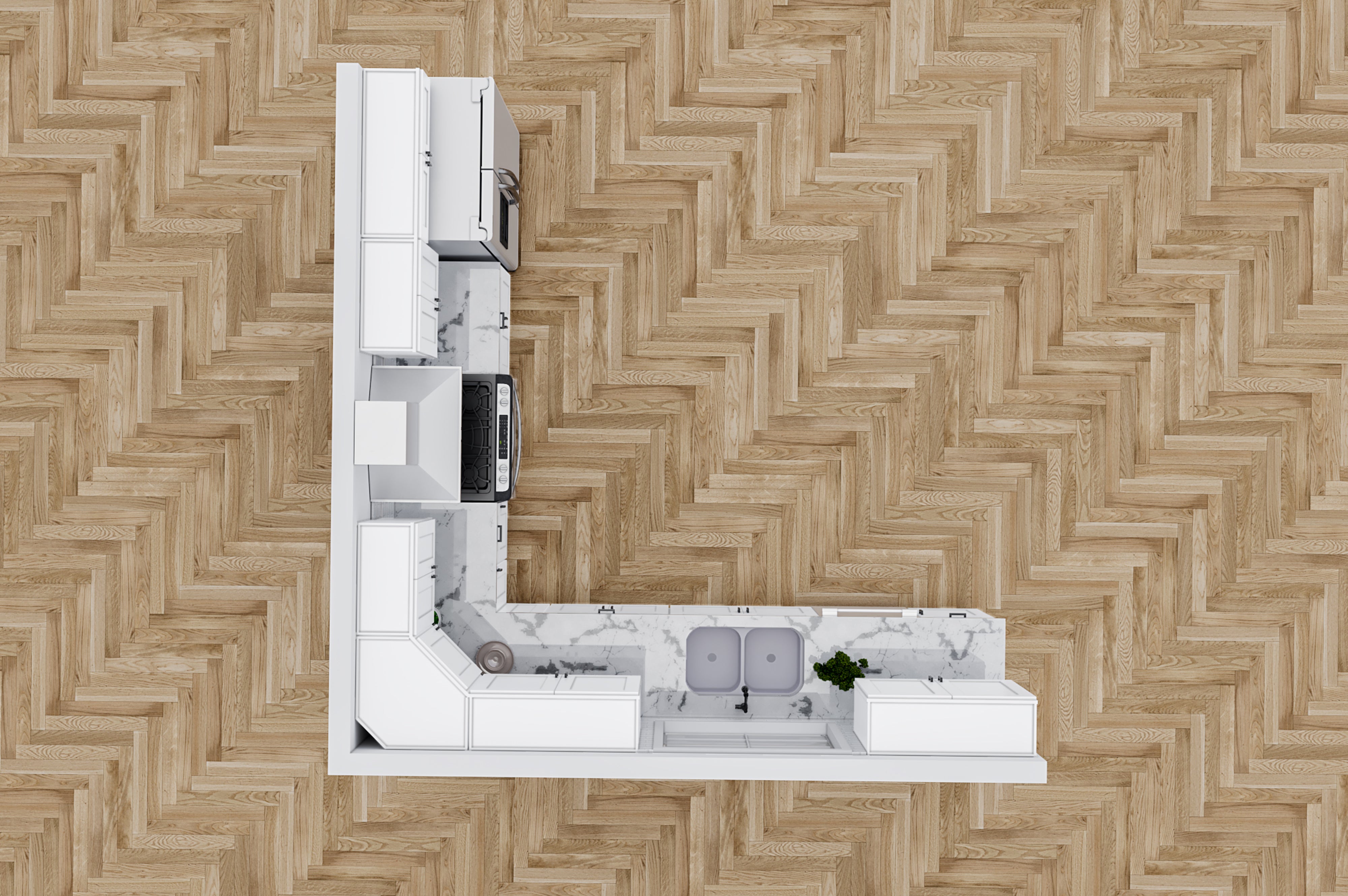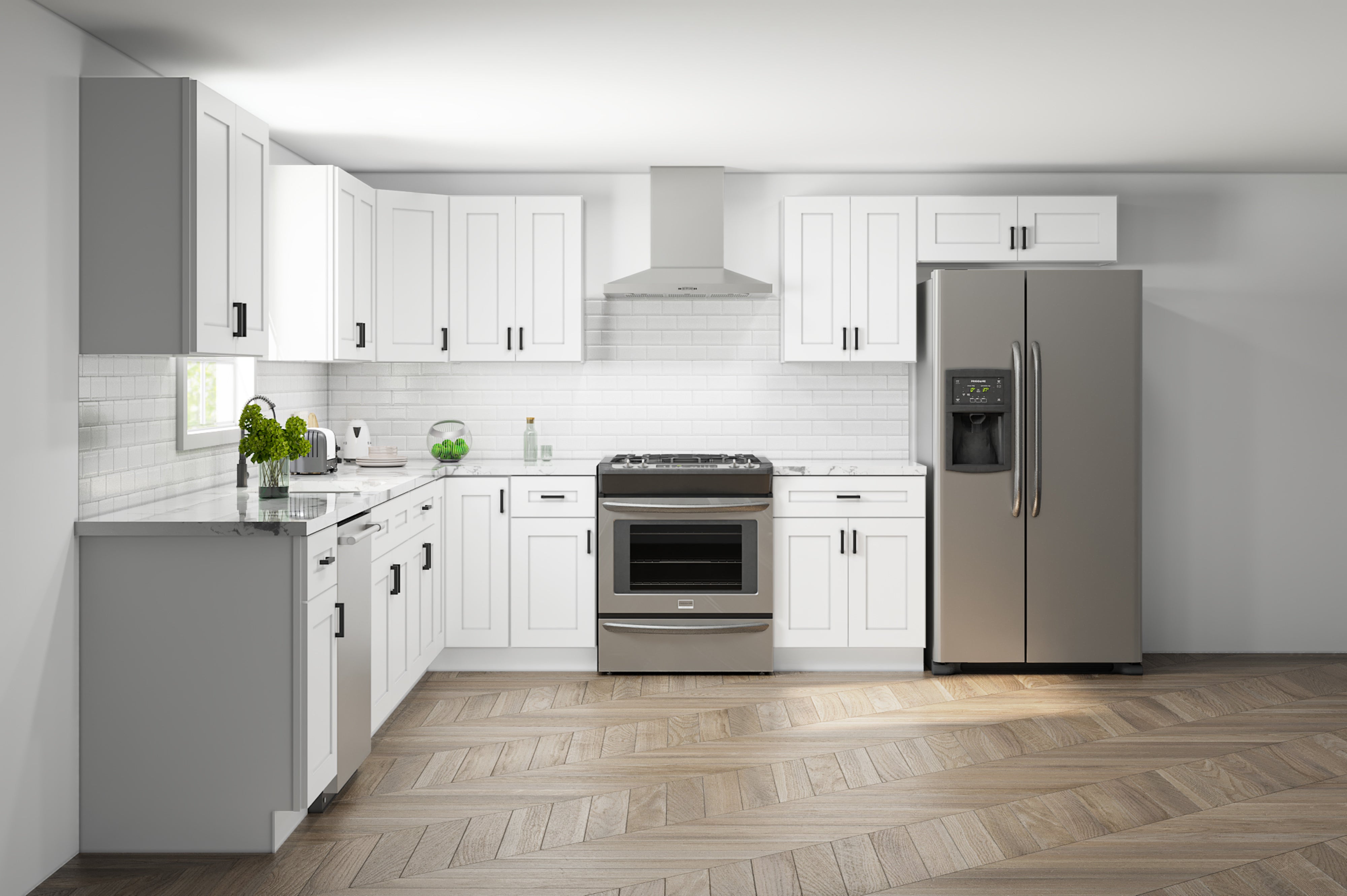 L-Shape 12 feet by 12 feet kitchen cabinet combination. Ideal for kitchen walls that fit at least 84 inches in height. White Shaker cabinets feature a full overlay recessed door style with a smooth painted MDF finish. Built with ½" plywood boxes, soft-close hinges, and dovetail drawers with under-mount glides, they offer both durability and modern elegance. Natural clear-coated interiors and adjustable plywood shelves complete the high-quality construction.