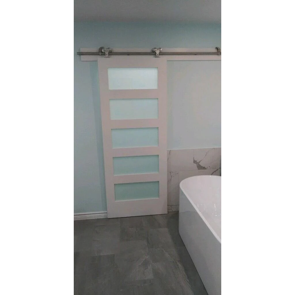 This 30 in x 80 in solid core slab has a pine core and an MDF veneer and frosted glass. Panels are a true shaker style with a simple and clean look. Slabs are stocked at our Dallas showroom and can be picked up at our store or shipped nationwide. Slabs do not have any bore holes or hinge placements. Available in standard sizes of 18 in, 24 in, 28 in, 30 in, 32 in, and 36 in. Prehung options are available for all sizes.