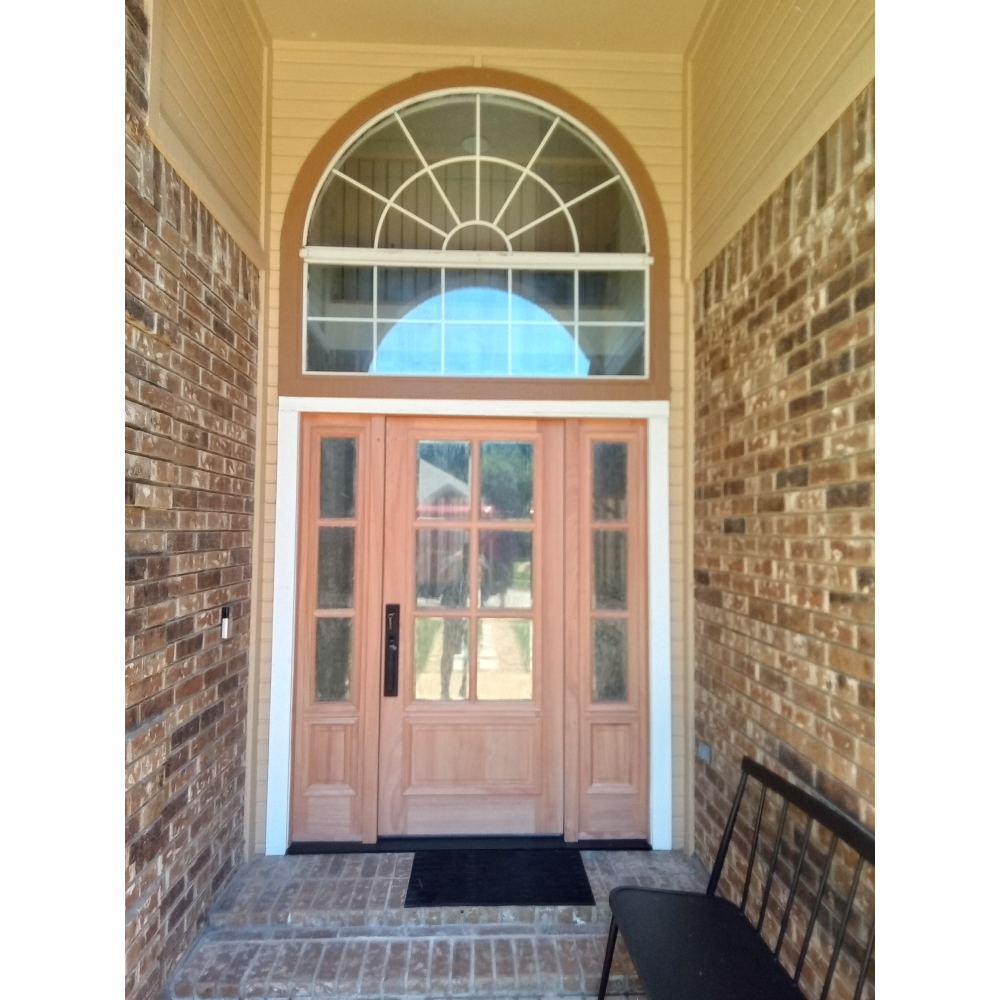 The door features a traditional and elegant design with a solid mahogany wood frame and six rectangular glass panels arranged in a 2x3 grid. The door includes two sidelights, one on each side, which are also made of clear glass panels within mahogany frames. The sidelights are designed to match the door, creating a harmonious and cohesive appearance for the entrance.The door is prehung, which means it comes with the frame already attached and ready to install. The frame is also made of solid mahogany wood and includes a threshold and weatherstripping to help prevent drafts and moisture from entering the home. Overall, this door is a beautiful and classic choice for an exterior entrance, combining the warmth and richness of mahogany wood with the light and openness of glass panels. The prehung design makes installation easier and more efficient, while the matching sidelights create a sense of balance and symmetry for the entrance. The clear glass panels give the door and sidelights a clean and simple appearance, while the mahogany wood frames add a touch of luxury and sophistication to the design.